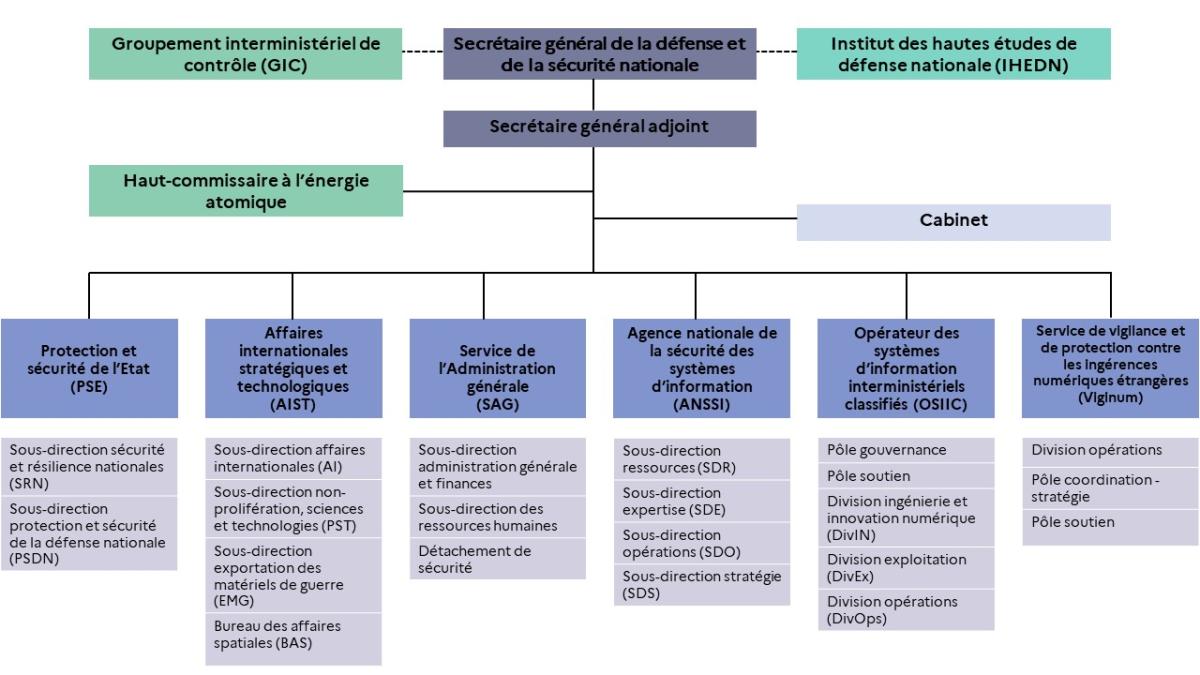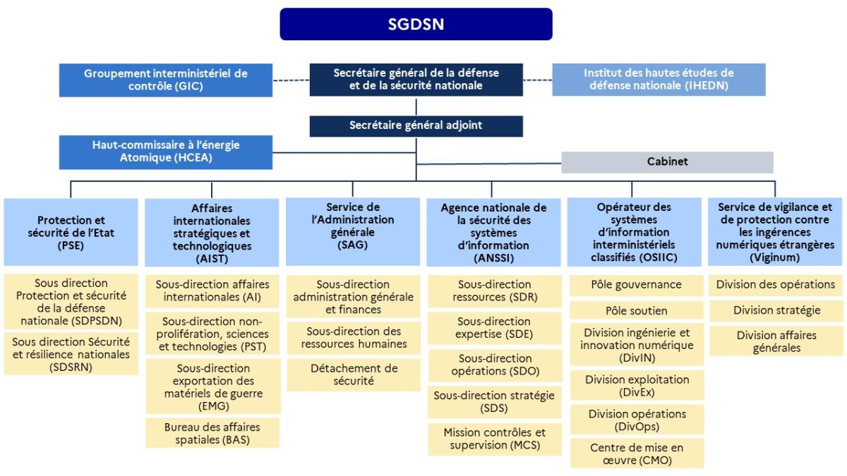Un service au coeur de l'exécutif Découvrir le SGDSN 04 novembre 2022 Dans un monde marqué par la multiplicité et l’imbrication des menaces, la France doit constamment adapter et renforcer ses dispositifs de protection de façon systématique. Dans cette rubrique Dans la même rubrique Découvrir le SGDSN Un service au coeur de l'exécutif Textes concernant le SGDSN Circulaires et instructions Histoire Direction Le secrétaire général et le secrétaire général adjoint Directions d’administration Services à compétence nationale Composantes Le secrétariat du conseil de défense et de sécurité nationale Protection et sécurité de l’Etat Affaires internationales, stratégiques et technologiques Service de l’administration générale Agence nationale de la sécurité des systèmes d’information Opérateur des systèmes d’information interministériels classifiés Service de vigilance et protection contre les ingérences numériques étrangères Groupement interministériel de contrôle Le haut-commissaire à l'énergie atomique L'institut des hautes études de défense nationale Placé au cœur de l’exécutif, le SGDSN assiste le Premier ministre dans l’exercice de ses responsabilités en matière de défense et de sécurité nationale. Il appuie notamment la prise de décision politique en assurant le secrétariat des conseils de défense et de sécurité nationale, présidé par le chef de l’Etat. Le champ d’intervention du SGDSN couvre l’ensemble des questions stratégiques de défense et de sécurité, dans le domaine de la programmation militaire, de la politique de dissuasion, de la sécurité intérieure concourant à la sécurité nationale, de la sécurité économique et énergétique, de la lutte contre le terrorisme et de la planification des réponses aux crises. Le SGDSN assure trois missions principales. La première porte sur la veille et l’alerte face aux menaces et aux risques. Dans ce cadre, il est chargé du suivi des crises, de la préparation des plans gouvernementaux et de l’organisation de l’État en temps de crise.La deuxième mission consiste à conseiller et rédiger les décisions prises par l’exécutif en matière de défense et de sécurité nationale. Le SGDSN contribue ainsi à l’élaboration des projets de loi et des textes réglementaires dans ses domaines de compétences. Troisième mission, le SGDSN agit comme opérateur, notamment dans la gestion des habilitations, des documents classifiés, des communications gouvernementales – au travers de l’opérateur des systèmes d’information interministériels classifiés (OSIIC) – ou encore de la sécurité des systèmes d’information et la cyberdéfense. Rattachée au SGDSN, c’est l’Agence nationale de la sécurité des systèmes d’information (ANSSI) qui assure cette dernière mission. Enfin, VIGINUM, le service de vigilance et de protection contre les ingérences numériques étrangères, créé en 2021, est le service technique et opérationnel de l’Etat chargé de la vigilance et de la protection contre les ingérences numériques étrangères. Par ailleurs, le SGDSN soutient administrativement le GIC et exerce la tutelle du Premier ministre sur l’Institut des hautes études de défense nationale (IHEDN). Situé au point de convergence de l’ensemble des dossiers intéressant la sécurité intérieure et extérieure de la France, le SGDSN est, à la fois, une administration de mission et un opérateur de sécurité Organigramme SGDSN Transcription Fermer la transcription Le secrétaire général de la défense et de la sécurité nationale est appuyé par le secrétaire général adjoint dans l’exercice de ses fonctions. Ils bénéficient du soutien du cabinet, dont les conseillers leur apportent une expertise de proximité. Le SGDSN se composent de trois directions : La direction protection et sécurité de l’Etat, divisée en deux sous-directions : Sécurité et résilience nationales Protection et sécurité de la défense nationale La direction affaires internationales stratégiques et technologiques, divisée en trois sous-directions : Affaires internationales Non-prolifération, sciences et technologies Exportation de matériels de guerre Le service de l’administration générale, composé du détachement de sécurité et de deux sous-directions : Administration générale et finances Ressources humaines A côté des directions historiques, trois services à compétence nationale ont également vu le jour : L’Agence nationale de sécurité des systèmes d’information, composée de quatre sous-directions : Ressources Expertise Opérations Stratégie L’Opérateur des systèmes d’information interministériels classifiés, composé de deux pôles et trois divisions : Pôle soutien Pôle gouvernance Division ingénierie et innovation numérique Division exploitation Division opérations Le Service de vigilance et de protection contre les ingérences numérique étrangère, qui se compose de la division opérations et de deux pôles : Pôle coordination – stratégie Pôle soutien Par ailleurs, le secrétaire général de la défense et de la sécurité nationale assure la tutelle de l’Institut des hautes études de défense nationale et la gestion administrative et budgétaire du Groupement interministériel de contrôle. Haut de page