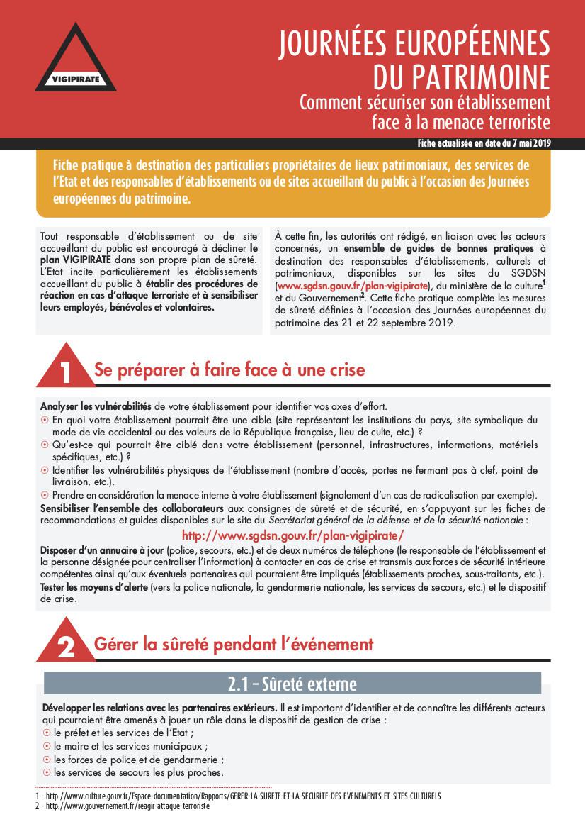Journées européennes du patrimoine. Comment sécuriser son établissement face à la menace terroriste ? Vigipirate 06 septembre 2017 Fiche pratique à destination des particuliers propriétaires de lieux patrimoniaux, des services de l’Etat et des responsables d’établissements ou de sites accueillant du public à l’occasion des Journées européennes du patrimoine. Sécurité Télécharger la fiche Journées européennes du patrimoine. Comment sécuriser son établissement face à la menace terroriste ? PDF - 322.9 KB Publications qui pourraient vous intéresser Guide "Tous responsables" Sécurité Actualités du SGDSN Guides | 20 novembre 2025 Le réseau des AISI publie les premiers résultats d’expérimentations conjointes Cybersécurité Sécurité INESIA Informations | 14 février 2025 Découvrir toutes les publications du SGDSN