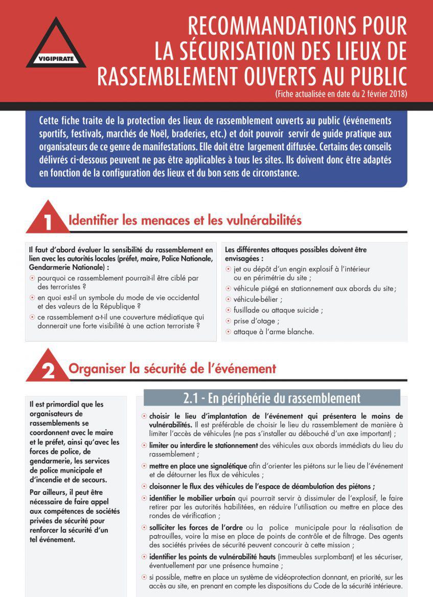 Recommandations pour la sécurisation des lieux de rassemblement ouverts au public Vigipirate 01 mars 2018 Cette fiche concerne la protection des lieux de rassemblement ouverts au public et a pour objectif de rappeler les recommandations nécessaires à la sécurité de tels événements. Elle doit être largement diffusée. Sécurité Télécharger la fiche Recommandations pour la sécurisation des lieux de rassemblement ouverts au public PDF - 64.3 KB Publications qui pourraient vous intéresser Guide "Tous responsables" Sécurité Actualités du SGDSN Guides | 20 novembre 2025 Le réseau des AISI publie les premiers résultats d’expérimentations conjointes Cybersécurité Sécurité INESIA Informations | 14 février 2025 Découvrir toutes les publications du SGDSN