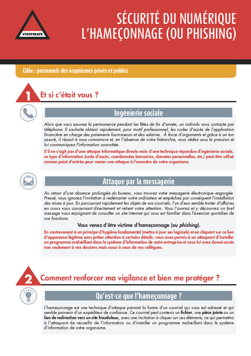 Sécurité du numérique : l’hameçonnage (ou Phishing) Vigipirate 02 novembre 2017 Cible : personnels des organismes privés et publics Systèmes d’informations Télécharger la fiche Sécurité du numérique : l’hameçonnage (ou Phishing) PDF - 59.8 KB Publications qui pourraient vous intéresser OSIIC : Une nouvelle feuille de route stratégique qui fixe le cap Systèmes d’informations Informations | 16 avril 2025 Revue stratégique de cyberdéfense Systèmes d’informations Informations | 15 mars 2018 Découvrir toutes les publications du SGDSN