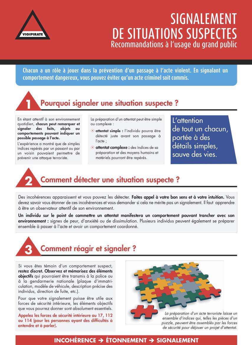 Signalement des situations suspectes : recommandations à l’usage du grand public Vigipirate 05 juillet 2017 Chacun a un rôle à jouer dans la prévention d‘un passage à l‘acte violent. En signalant un comportement dangereux, vous pouvez éviter qu‘un acte criminel soit commis. Sécurité Télécharger la fiche Signalement des situations suspectes : recommandations à l’usage du grand public PDF - 1 273.9 KB Publications qui pourraient vous intéresser Guide "Tous responsables" Sécurité Actualités du SGDSN Guides | 20 novembre 2025 Le réseau des AISI publie les premiers résultats d’expérimentations conjointes Cybersécurité Sécurité INESIA Informations | 14 février 2025 Découvrir toutes les publications du SGDSN