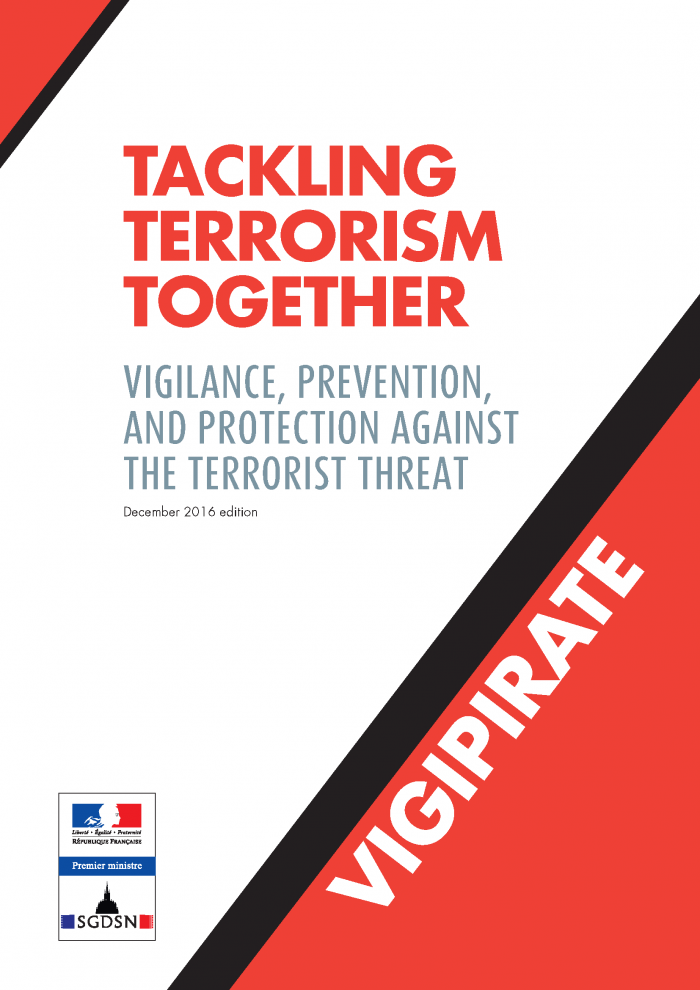 Tackling terrorism together : vigilence, prevention and protection against the terrorist threat Vigipirate 01 décembre 2016 English version of the document "Plan VIGIPIRATE. Faire face ensemble" Sécurité Download the English version of the document "Plan VIGIPIRATE. Faire face ensemble" PDF - 8 701.6 KB Publications that might interest you Guide "Tous responsables" Sécurité Actualités du SGDSN Guides | 20 novembre 2025 Le réseau des AISI publie les premiers résultats d’expérimentations conjointes Cybersécurité Sécurité INESIA Informations | 14 février 2025 Discover all SGDSN publications