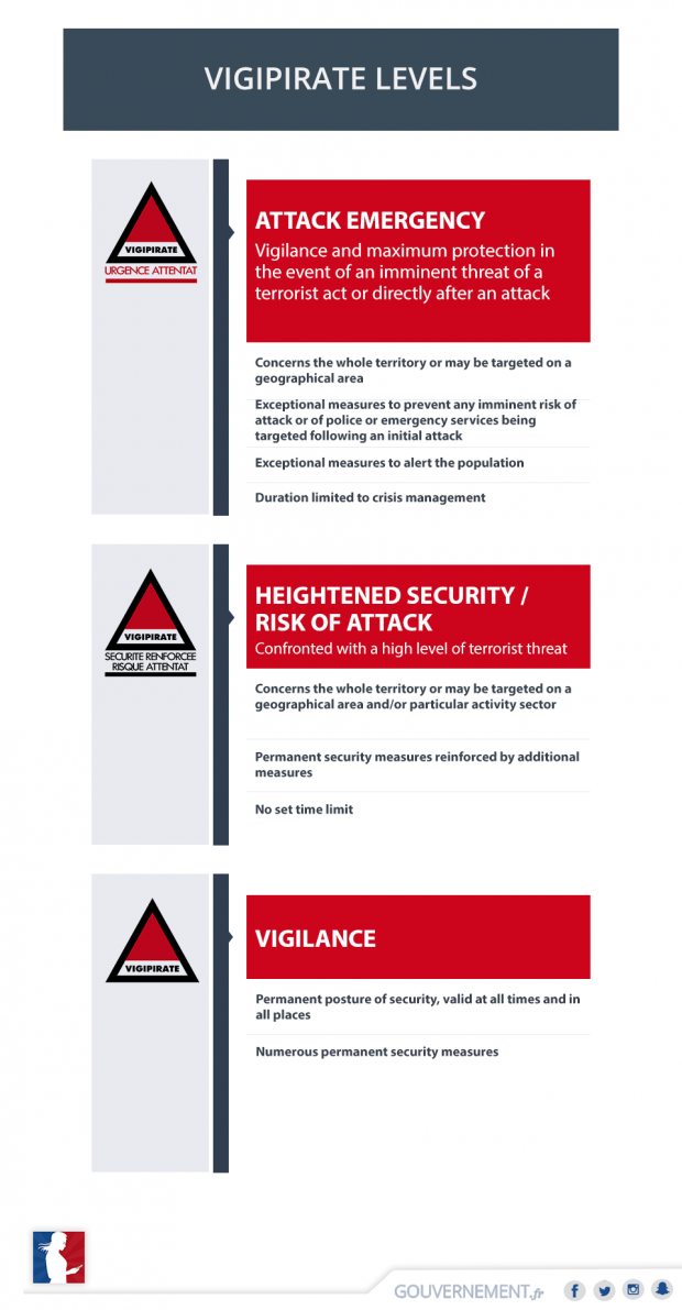 Vigipirate levels Vigipirate 02 décembre 2016 The Vigipirate plan has three security levels allowing the internal security system to adapt quickly according to the intensity of the terrorist threat. Sécurité The 3 threat levels are designed to give a broad indication of the likehood of terrorist attack. Tool to prepare the internal security system. Download the document Vigipirate levels PNG - 324.5 KB Publications that might interest you Guide "Tous responsables" Sécurité Actualités du SGDSN Guides | 20 novembre 2025 Le réseau des AISI publie les premiers résultats d’expérimentations conjointes Cybersécurité Sécurité INESIA Informations | 14 février 2025 Discover all SGDSN publications